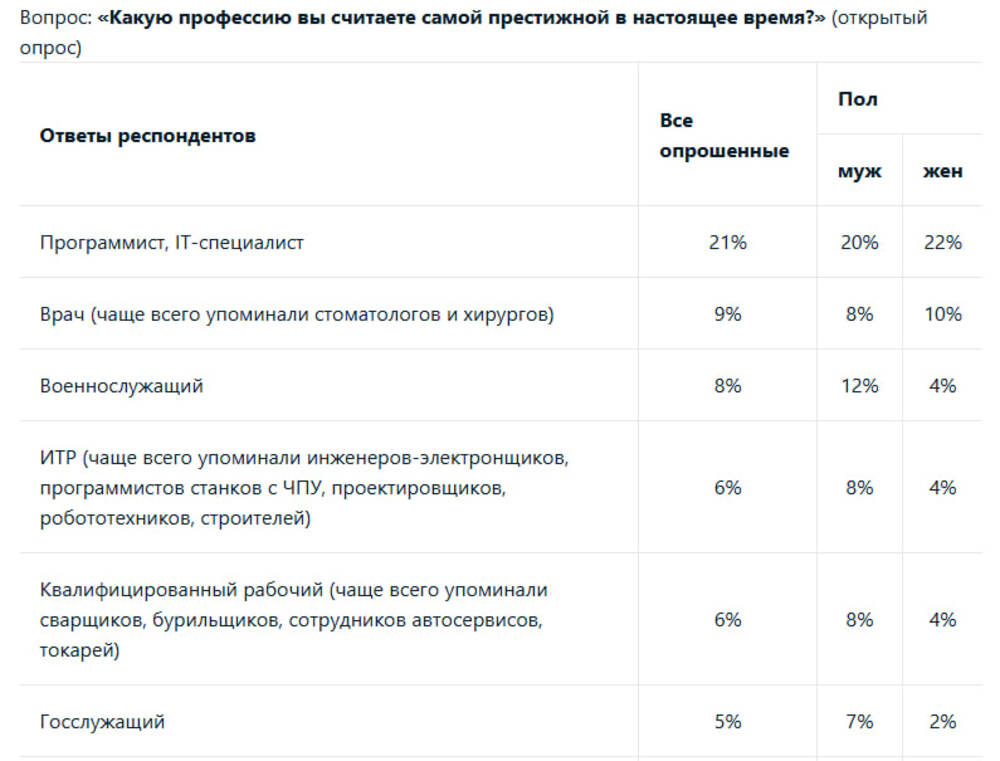 При этом между понятиями престижа и доходности россияне отмечали во время опроса существенную разницу. Так, если профессия IT-специалистов в 2024 году воспринималась россиянами не только как самая престижная, но и как самая доходная (30%), то в отношении медработников только 14% опрошенных назвали профессию доходной.