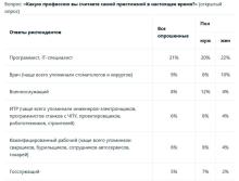 Чаще всего респонденты называли среди врачей стоматологов и оперирующих хирургов. Престижными медицинские профессии чаще считают женщины (10 против 8% среди мужчин). Мужчины отдают приоритет профессии военного.