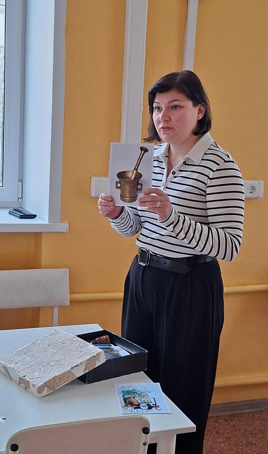 Заместитель директора библиотеки Наталья Лисицына и научный сотрудник музея Дарья Зверева в игровой форме познакомили детей с историей медицины и предметами старинной аптеки. Ребята увидели настоящий старинный сундук с аптекарскими предметами: баночки для лекарств, ступка и пестик для измельчения различных ингредиентов перед приготовлением рецепта, аптекарские весы, старинная книга «Письма к матерям об уходе за здоровыми и больными детьми», написанная более ста лет назад.